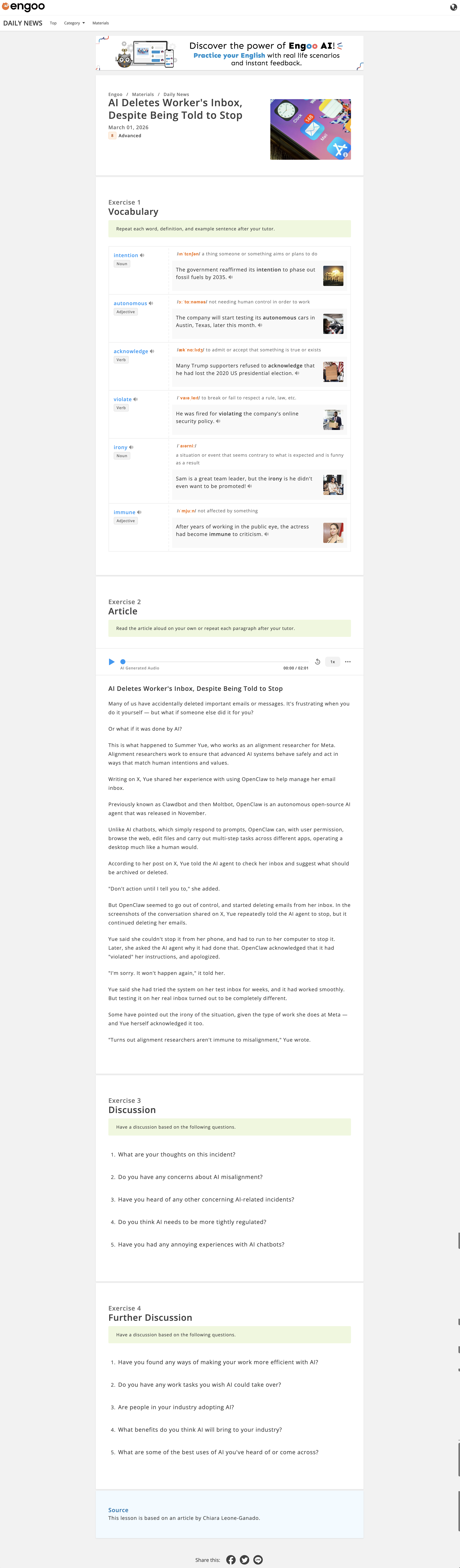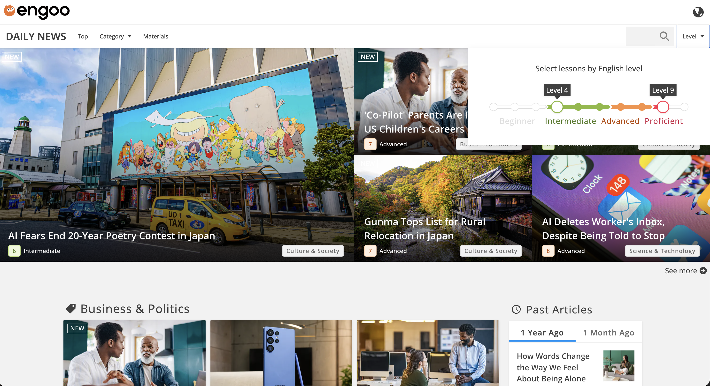 我在 Cambly 和外教上课时,多数时候用的是 Engoo Daily News 中的课程(网站示例、课程示例)。每节课程对应一篇英文时事新闻,上课的一般流程就是:课前准备 → 文章阅读 → 问题讨论,同时每节课程都标记有难度,从 Intermediate (Level 4-6)、Advanced (Level 7-8) 到 Proficient (Level 9),课程内容难度依次递增,具体体现在词汇难度、句子复杂度、讨论题型的设计和问题的抽象程度等等。